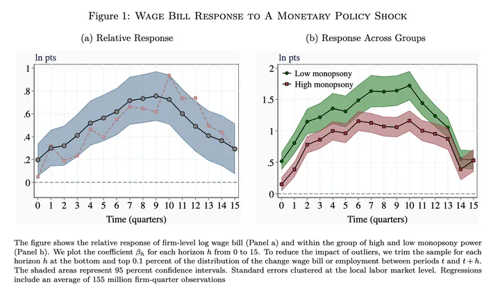 This paper studies how labor market power affects the transmission of monetary policy. Using administrative U.S. Census data, we show that firms with high monopsony power—those accounting for over 10 percent of the local wage bill—respond less to monetary policy in terms of their wage bill and employment. We then develop a New Keynesian model with heterogeneous firms and oligopsonistic competition to interpret these findings. Wage stickiness combined with firms’ labor market power is key to generating the heterogeneous responses that we document. Our model highlights two channels through which oligopsony shapes the aggregate effects of monetary policy: partial passthrough and misallocation. Calibrated to U.S. labor markets, the model implies that the decline in labor market power since the 1980s has increased the output response to monetary policy by about 50 percent.
